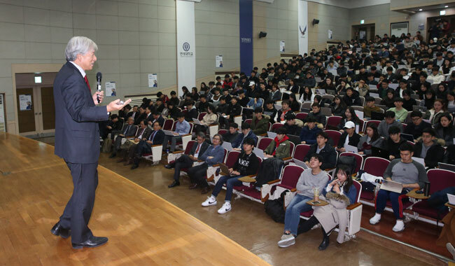 2017년 11월 16일 염재호 고려대 총장이 서울 연세대 백양관에서 특강을 하고 있다. 염 총장은 “대학에 들어오기 위해 고생한 만큼 지금까지의 굴레에서 벗어났으면 한다”며 “끊임없이 질문하면서 다음 단계로 발을 내디디라”고 했다. 사진=조선일보DB