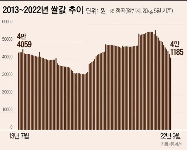 자연스레 쌀값은 지난해 10월 정점을 찍은 뒤 하락세를 이어갔고, 최근엔 4년 반 만에 가장 낮은 수준을 기록하고 있다. 통계청 산지쌀값조사 통계에 따르면, 쌀(정곡) 20㎏ 가격은 4만1185원으로 2018년 2월(4만448원) 이후 최저치를 기록했다. 무려 10년 전인 2013년(4만원대)과도 가격 차이가 거의 없다.