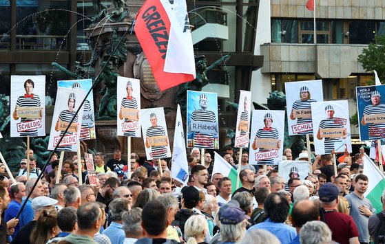 지난 5일(현지시간) 독일에서 벌어진 우파 단체의 우크라이나 전쟁 지원 반대 시위. 유류 가격 상승에 따른 인플레이션이 시위를 촉발했다. 상단의 피켓에 패러디된 인물은 독일의 주요 정치인. [로이터=연합뉴스]