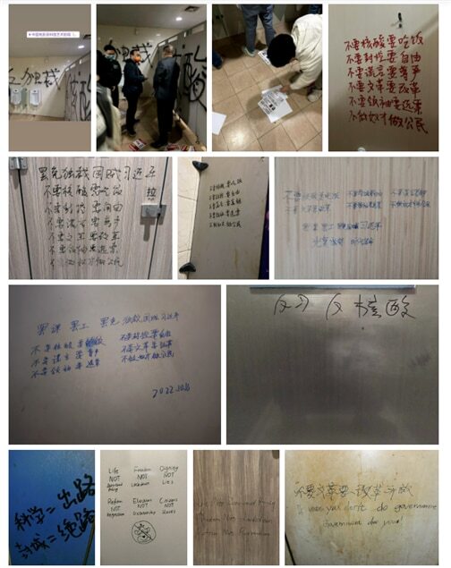 <중국 곳곳의 화장실 문과 벽에 적힌 펑리파의 구호들. 그 밖에도 과학=출로, “봉성(도시 봉쇄)=절로(絶路)”라는 낙서도 보인다. 사진/twitter.com>
