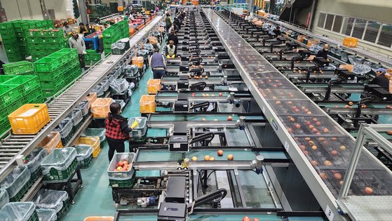 지난 10월 28일 충남 예산의 APC센터에서 농가들이 보내온 엔비사과를 선별하고 있다. 신진호 기자