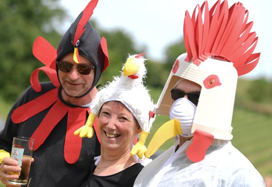 닭은 인간이 세상에서 가장 많이 소비하는 육류다. 하지만 닭과 인간이 관계가 처음부터 그랬던 건 아니었다. 대부분 인류 역사에서 닭은 초자연적이고 카리스마 넘치는 모습 때문에 추앙 받는 존재였다. 사진은 2019년 6월 9일 독일에서 열린 닭 흉내 경연대회에 참여한 사람들. 사진 DPA=연합뉴스