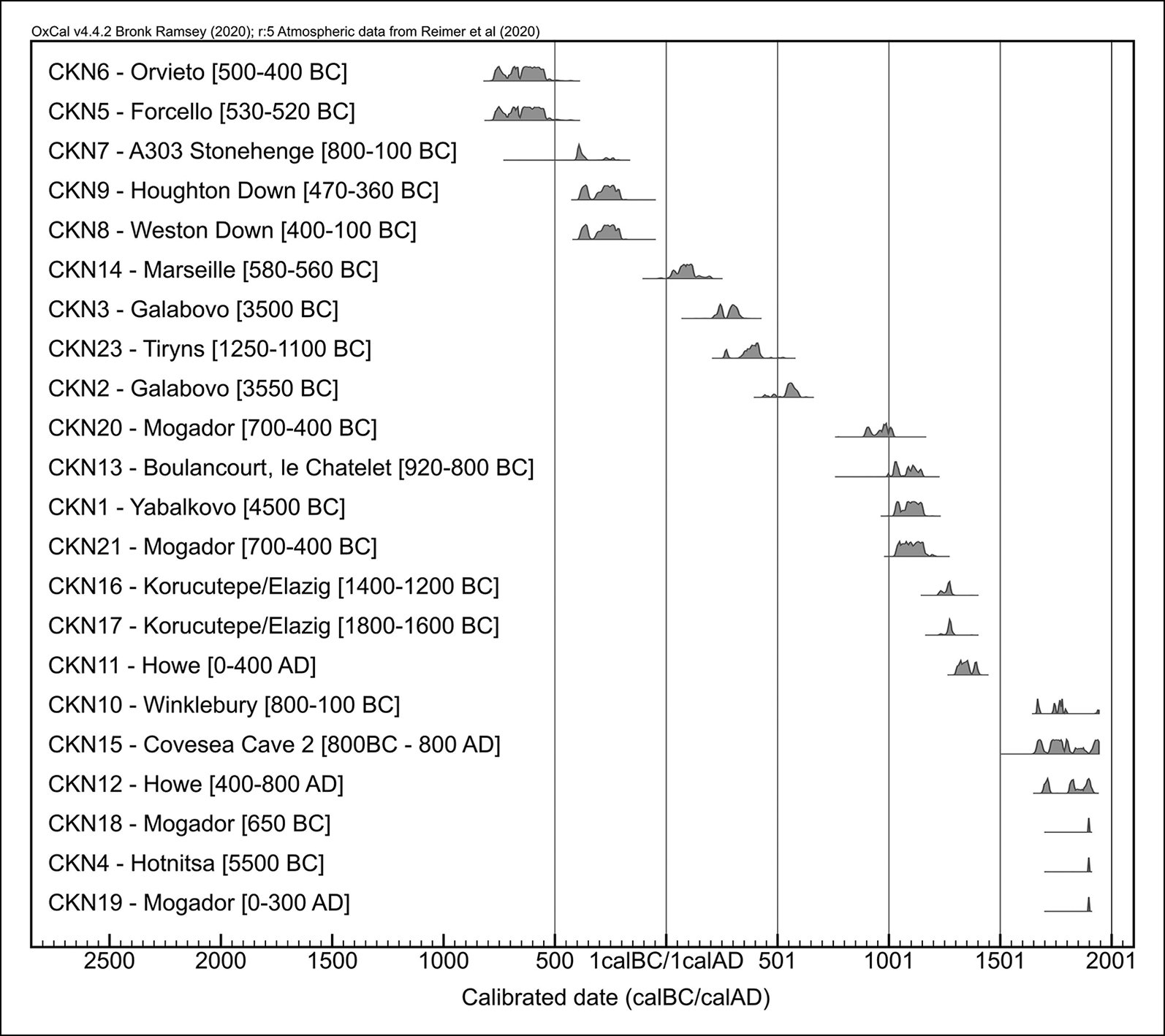 이번 연구 과정에서 나온 무수한 오류들. 세계 여러 유적지에서 발굴한 닭뼈에 대한 방사성 탄소 연대 측정 결과다. 왼쪽 유적지 옆에 쓰인 것이 닭 뼈에 기록된 추정 날짜이고, 오른쪽이 검사 결과. 기원전에 나온 것으로 기록된 닭 뼈가 극히 최근인 경우도 있었다. 사진 Larson et al, Antiguity, 2022
