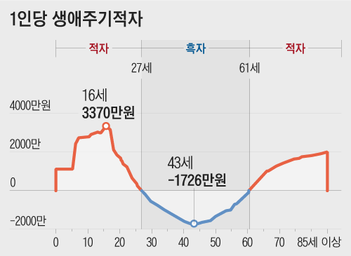 1인당 생애주기적자는 16세 때 3370만원으로 최대 적자를 기록했다. 27세부터 노동소득이 소비보다 많은 흑자 구간으로 진입했고 43세에 1726만원으로 흑자 규모가 가장 컸다. 61세부터는 다시 적자로 전환한다. 인생에서 흑자를 내는 기간은 34년에 불과한 셈이다.