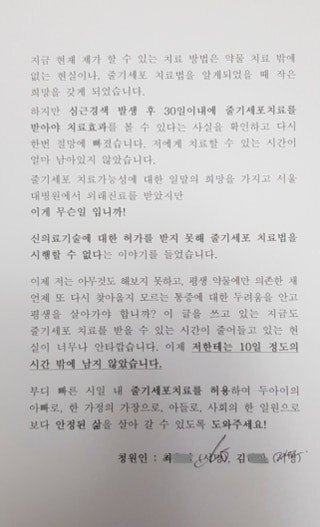 신의료기술에 대한 허가를 받지 못해 줄기세포 치료법을 시행할 없다는 얘기를 들었습니다. 이제 저는 아무 것도 해보지 못하고 평생 약물에만 의존한 채 언제 또 찾아올지 모르는 통증에 대한 두려움을 안고 평생을 살아가야 합니까? 이 글을 쓰고 있는 지금도 줄기세포 치료를 받을 수 있는 시간이 줄어들고 있는 현실이 너무 안타깝습니다. 이제 저한테는 10일 정도의 시간 밖에 남아 있지 않습니다. 부디 빠른 시일 내에 줄기세포 치료를 허용하여 두 아이의 아빠로, 한 가정의 가장으로, 아들로, 사회의 한 일원으로 보다 안정된 삶을 살아갈 수 있도록 도와주세요!“