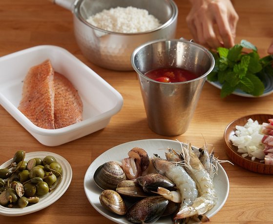 재료(2~3인분): 쌀 200g, 바지락 100g, 새우 5마리, 흰살생선 80g, 오징어 70g, 베이컨 3줄, 다진 양파 3큰술, 올리브 10알, 케이퍼베리 5개, 레몬 1조각, 애플민트 약간, 물 100㎖, 토마토홀 200㎖, 소금‧후춧가루 약간씩