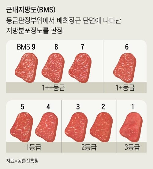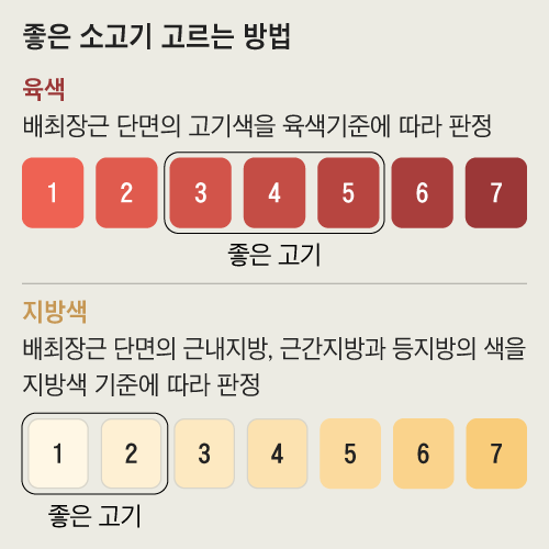 농진청에 따르면 좋은 소고기는 밝은 선홍색을 띤다. 지방색은 우윳빛을 띠면서 윤기가 나야 한다. 위 사진에서 고기색으로는 3, 4, 5번이 좋은 고기고, 지방색은 1, 2번과 같은 색을 띠어야 좋은 고기다.