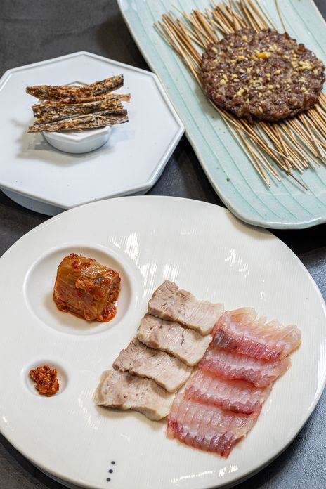 서울 ‘해남천일관’ 홍어삼합과 대갱이포, 떡갈비(앞에서부터). 해남천일관에서는 음식을 하나씩 코스로 낸다. 해남 ‘천일식당’에서는 옛 방식대로 한상에 차려 낸다./이신영 영상미디어 기자