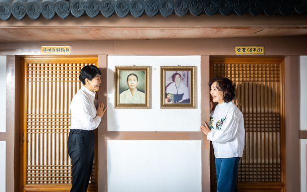 이화영(왼쪽) 서울 '해남천일관' 대표와 오현화 해남 '천일식당' 대표가 창업자 고 박성순 여사와 2대 이정례씨 사진을 사이에 두고 웃고 있다. 왼쪽 사진이 박성순 여사, 오른쪽 사진이 이정례씨다./이신영 영상미디어 기자