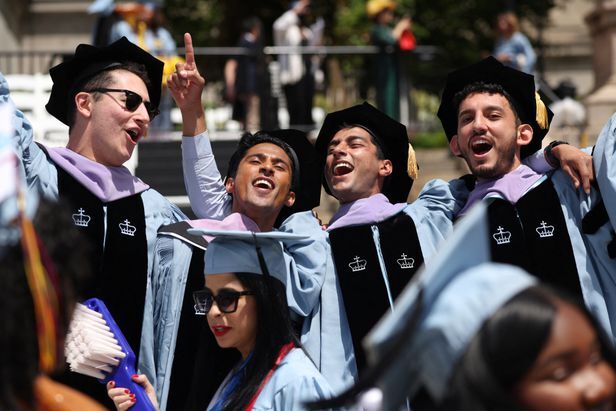 지난 2022년 미 뉴욕시 소재 아이비리그 대학인 컬럼비아대의 졸업식 모습. 미 2년제 이상 대학 진학류른 62%이며, 특히 4년제 대학 진학률은 40%를 밑돌고 있다. 대학 진학자 중 절반이 좀 넘는 60%만이 졸업을 하고 있다고 한다. /로이터 연합뉴스