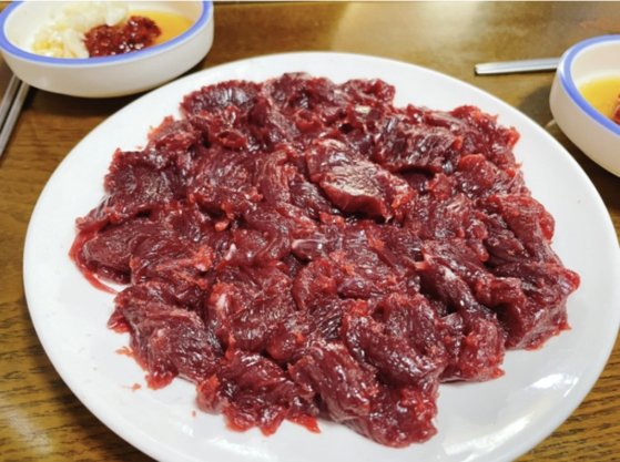 장혜주(81) 할머니가 운영하는 대구 뭉티기집의 생고기 한접시. [사진 Moon 블로그]