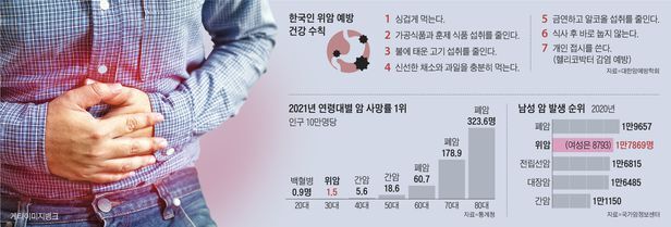 2021년 연령대별 암 사망률을 보면, 위암이 30대에서 1위다. 지난 3년간 유방암이 1위였다가, 위암이 다시 올라왔다. 방심 속에 젊은 층 위암 조기 발견이 늦은 탓으로 본다. 위암 악성도도 젊은 환자에서 높다. 암이 위장 벽에 넓게 깔리는 미만형 위암도 젊은 환자에게 많다. 이런 경우 수술로 제거하기 쉽지 않다. 이에 30~40대 젊은 사람도 최소 2년에 한 번 위내시경 검진을 받는 게 좋다. 집안에 위암 환자가 있거나, 속쓰림 소화불량이 잦거나, 위축성 위염 진단을 받은 경우 등에는 검진을 철저히 해야 한다.