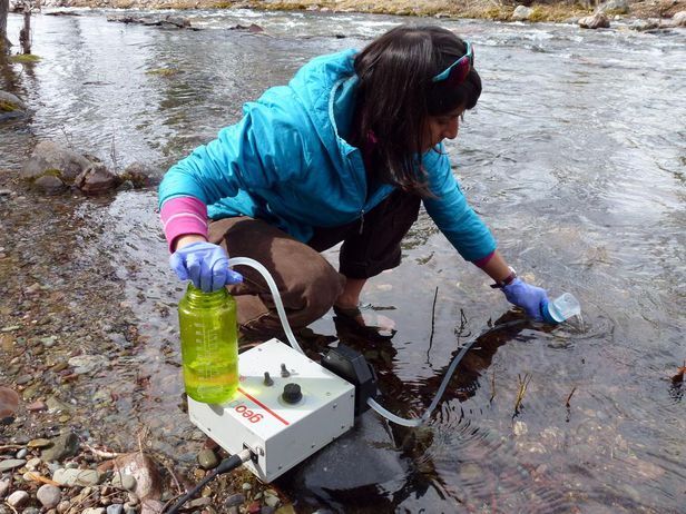오레건 주립대 연구진이 강에서 eDNA를 채취하고 있다. /오레건주립대