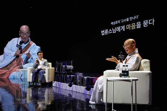 더중앙플러스 인사이트 세미나 '백성호의 고수를 만나다'에서 법륜 스님이 '마음'을 주제로 한 물음들에 답을 하고 있다. 중앙포토