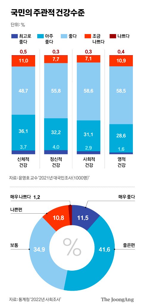물론 과학적으로나 의학적으로 타당성이 검증된 기준이다. 그렇다면 신체적 건강뿐 아니라 정신적·사회적·영적 건강은 어떤가. 건강검진에서는 특별한 이상이 없다고 들었다 하더라도 이 질문에 많은 국민이 건강을 자신하지 못한다. 나이 들수록 더욱 그렇다. 〈그래픽 참조〉