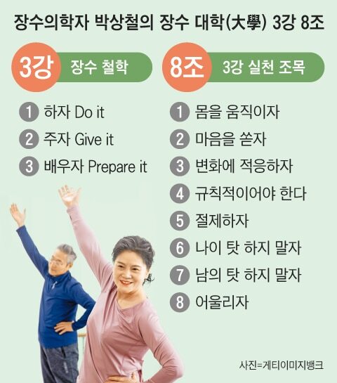 박 교수는 중국의 철학자 주자가 쓴 유교 경전 대학(大學)의 3강 8조를 은유하여, 장수 3강 8조목을 만들었다. 대학의 8조목은 수신(修身) 제가(齊家) 치국(治國) 평천하(平天下) 등으로 유명한 삶의 지표다.