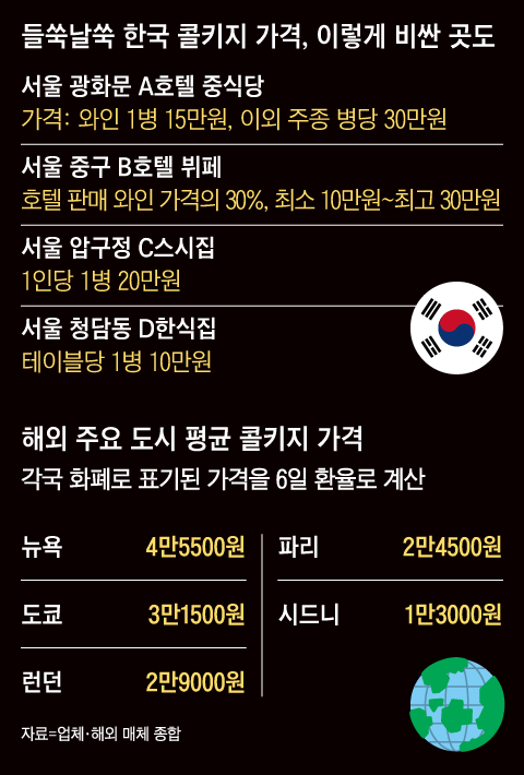 이 같은 소비자 불만이 근거가 없는 게 아니다. 한 글로벌 요리업체 조사에 따르면 미국 뉴욕 레스토랑의 평균 콜키지 가격은 우리 돈으로 4만5500원이었다. 외식업계 관계자는 “세계 최고 식당이 모여 있는 뉴욕보다 훨씬 비싸게 받는 일부 식당을 보면, 국내에선 콜키지가 고수익을 내는 수단이 돼 버린 것 같다”고 말했다.