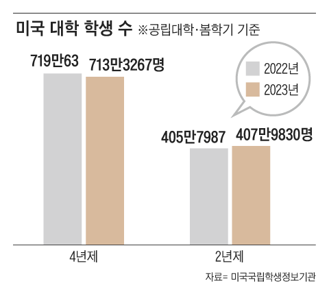 낮은 학비도 2년제 대학 부활에 한몫하고 있다. 미국 국립교육통계센터에 따르면, 지난해 미국의 4년제 대학(사립 기준) 연간 평균 등록금은 3만4041달러(약 4470만원)이다. 일부 명문 사립대는 7만달러(9200만원)를 넘는다. 반면 공립 2년제 대학의 평균 학비는 3564달러(463만원)로 사립 4년제의 10분의 1 수준이다. 미국에서 2년제는 절대다수가 공립이다.