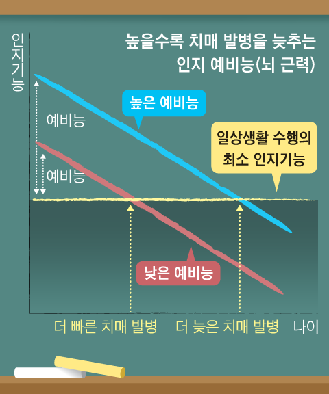 이를 이해하려면 인지 예비능이라는 개념을 먼저 짚고 넘어가야 한다. 이는 한마디로 ‘뇌 근력’이라고도 할 수 있겠다. 겨우겨우 걸을 근력만 남아있던 이는 폐렴으로 며칠만 침대에 앓아누워도 침대에서 일어날 수 없고, 근력 유지를 위한 최소한의 활동이 어려워지니 더욱더 기능이 나빠진다. 근육의 여유분이 적은 것이다. 하지만 근력의 여유분이 충분한 이는 침대에서 일어나 걷기 시작하면 걷는 활동 자체가 운동이 되어주므로 금세 회복되어 다시 일상적 신체 활동을 하게 된다. 그러니, 평소 만들어 둔 근력 여유분이 없으면 결국 침대에 누운 채 여생을 보내게 될 우려가 생긴다. 이때 걸을 수 있는 최소 근력과 현재 근력의 차이가 예비능이다. 여름철마다 주목받는 전력 예비량과도 비슷하다.
