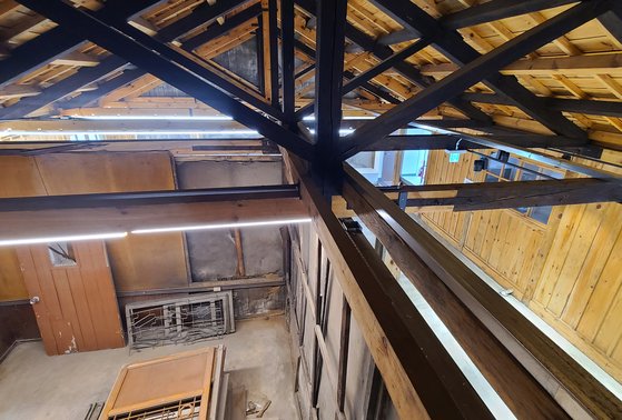 부산 우암동 소막마을 소 막사 내부. 소 막사를 개조해 피란민이 들어가 살았다. 천장이 높아 다락방을 추가로 들인 집도 많았다.
