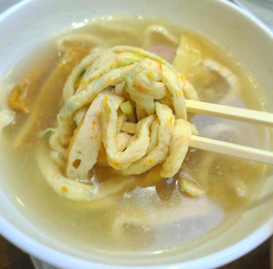 부산 깡통시장 '미도 어묵'의 어묵 우동. 우동 면 대신에 가늘고 길게 썬 어묵이 들어가 있다.