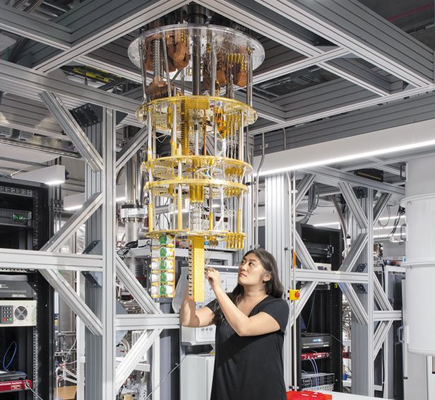 지난 6월 1일 뉴욕 맨해튼 외곽 요크타운하이츠의 푸른 녹지 위에 위치한 IBM 토머스 왓슨 리서치센터. IBM 창업자의 이름을 딴 이 연구소는 전 세계 양자컴퓨터 연구의 최전선이다. 100여 명에 달하는 양자컴 엔지니어들이 이곳에서 양자컴 전용 칩을 만들고 테스트한다. 연구소 내 양자컴 6대 중 5대엔 알루미늄 커버가 씌워져 있었고, 1대는 복잡한 전선이 얽혀 있는 본체를 드러낸 상태였다. 마치 황금색 샹들리에 같았다. 가장 밑단에는 양자컴의 핵심인 프로세서 칩이 달렸고, 칩과 연결된 수백 개의 전선이 상단에 여러 겹으로 탑재된 냉각기와 이어졌다.