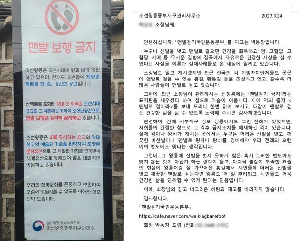 서울시내 한 왕릉에 세워진 '맨발 걷기 금지' 안내문(왼쪽)과 민간 동호회인 '맨발 걷기 시민운동본부' 카페 측에서 보낸 항의 공문. /뉴스1