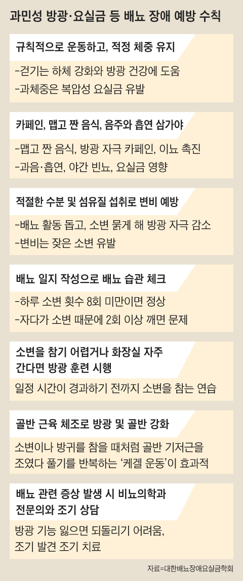 방광에 조금만 소변이 차도 요의를 느끼는 과민성 방광을 앓고 있다면 일정 시간 소변을 참는 것도 도움이 될 수 있다. 다만 전립선 비대증에 따른 절박뇨라면 소변을 참는 건 오히려 독(毒)이 된다. 배 교수는 “방광이 가득 찬 경우에 소변을 참으면 자칫 방광 기능을 손실할 수 있어 위험하다”며 “방광은 한번 기능을 손실하면 수술로도 회복이 어렵기 때문에 조기 관리가 중요하다”고 말했다.