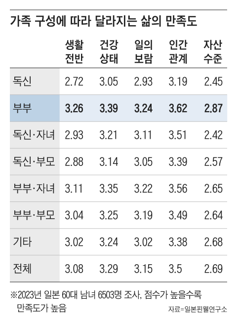 핀웰연구소의 노지리사토시(野尻哲史) 대표는 최근 본지와의 이메일 인터뷰에서 “은퇴하고 나서 누구와 사느냐는 노년기 삶의 행복을 좌지우지하는 중요한 변수”라면서 “배우자와 함께 사는 은퇴가정의 만족도가 가장 높은 반면, 혼자 사는 독거 노인들은 건강, 인간관계, 직장, 자산 등 모든 측면에서 삶의 만족도가 평균에 못 미쳐 격차가 컸다”고 말했다.