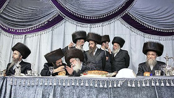 '하레디'로 불리는 초정통파 유대교인들이 지난 2019년 8월 20일 이스라엘 텔아비브 인근 하레디마을에서 열린 전통결혼식에 참석해 대화를 나누고 있다. AP=연합뉴스