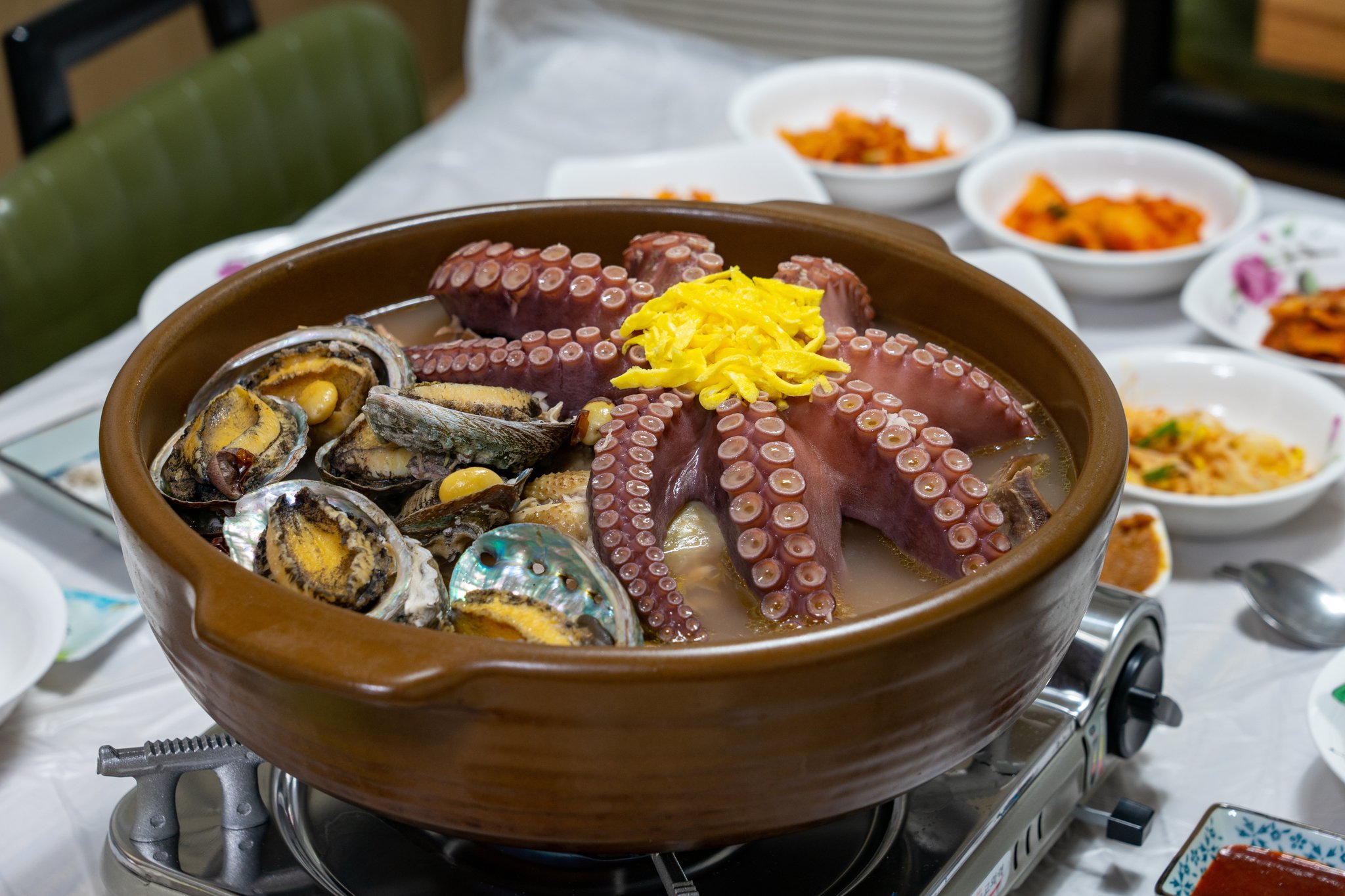 강진에는 ‘회춘탕(回春湯)’이란 보양식이 있다. 어떤 음식이길래 ‘다시 젊어진다’는 거창한 이름이 붙은 걸까. 강진읍 ‘하나로식당’에서 회춘탕을 주문하니 세숫대야만 한 냄비에 문어‧전복‧토종닭 등이 한데 담겨 나왔다. 정혜정 사장이 “수삼·헛개나무 등 열두 가지 한약재가 들어가는데, 이만한 보약이 없다”고 말했다. 국물 맛이 참 깊었다. 정 사장은 “좋은 해산물을 듬뿍 넣어 소금 간을 안 해도 깊은 국물 맛이 난다”고 설명했다.