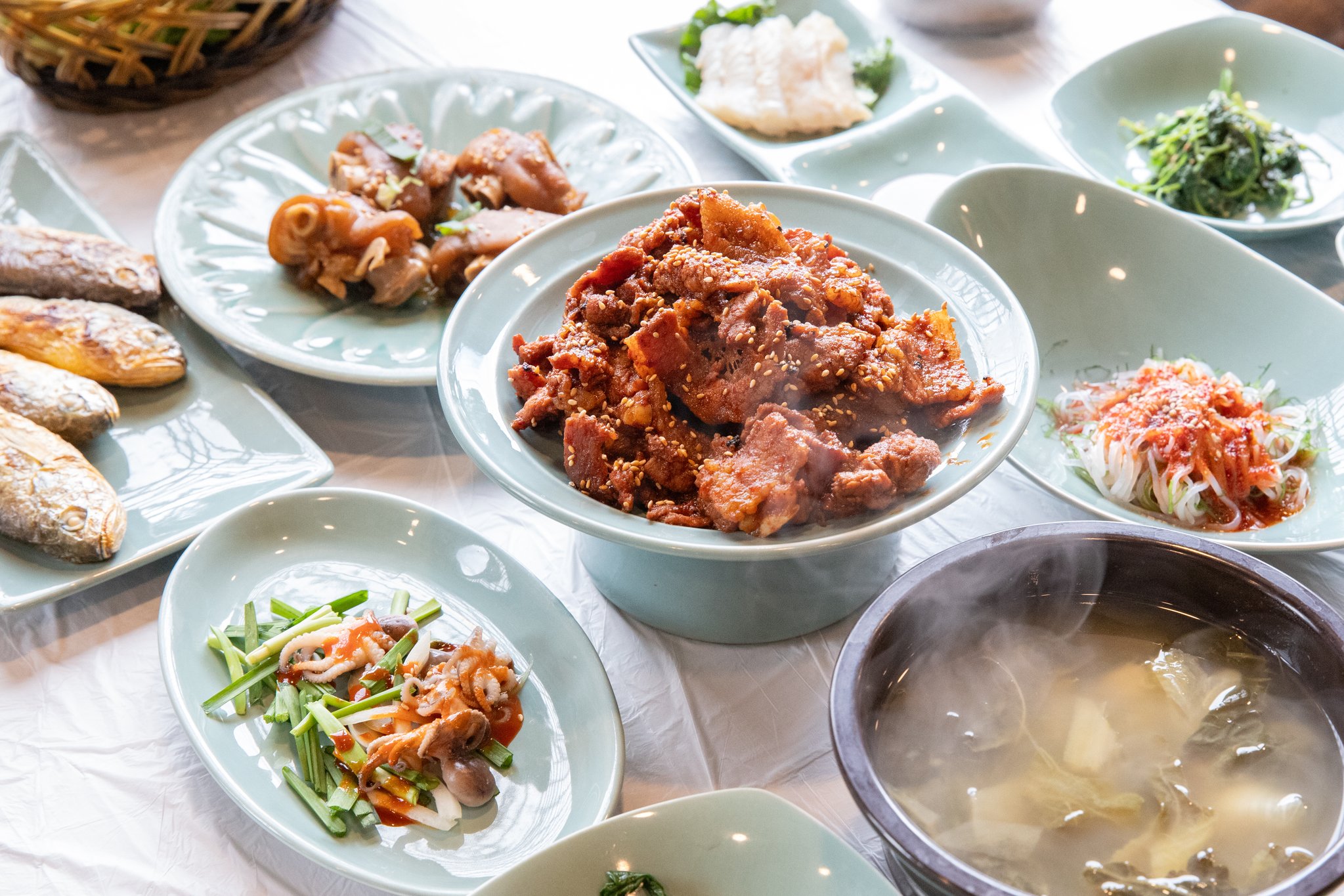 병영오일장 주변에 불고기 전문 식당 6곳이 모여 있다. 여러 식당 중 약 50년 역사를 자랑하는 ‘수인관’을 가봤다. 문을 열고 들어가자 자욱한 연기 속에서 고기를 굽고 있는 신정일(73) 사장이 보였다. 수인관 메뉴는 사실 한 종류다. 인원수에 따라 불고기 백반을 주문하면 즉시 한상차림을 내준다. 불고기를 비롯해 20가지 반찬이 청자 그릇에 담긴 모습이 한정식 같다. 강진 명물 토하젓도 나온다. 불고기 생김새는 흔한 제육볶음 같지만, 맛이 차원이 다르다. 불향이 강하면서도 질기지 않고 육즙이 가득하다. 신 사장은 “불 조절을 잘하는 게 불고기 맛의 핵심”이라고 말했다. 수인관 불고기는 2011년 특허 출원했다.