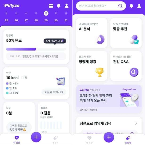 이용자가 복용 중인 영양제를 입력하면 자체 AI 건강 엔진이 섭취 상태를 점검하고 최적의 조합을 추천한다. 영양제를 언제 먹는 것이 가장 좋은지에 따라 일정을 짜주고 알림을 제공한다. 간헐적 단식, 식단 관리, 수분 보충, 운동 관리 등도 이 앱에서 할 수 있다. 필라이즈는 채혈 없이 혈당을 재는 연속혈당측정기와 연동한 AI 혈당 관리 프로그램 ‘슈가케어’도 이달 출시했다.