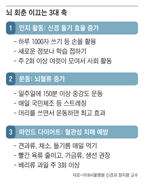 정 교수가 추천하는 뇌 회춘 3대 축은 인지 활동, 운동, 마인드 다이어트다. 새로운 정보를 접하고 새로운 학습을 하는 것은 뇌신경 세포를 연결하는 신경 돌기 효율을 증가시켜 뇌를 싱싱하게 만든다. 정 교수는 “뇌의 기능에서 가장 큰 부분을 차지하는 것이 언어 능력 회로와 손 운동 관할 영역”이라며 “이 둘을 동시에 사용하는 활동이 뇌 기능을 크게 증진시킨다”고 말했다.