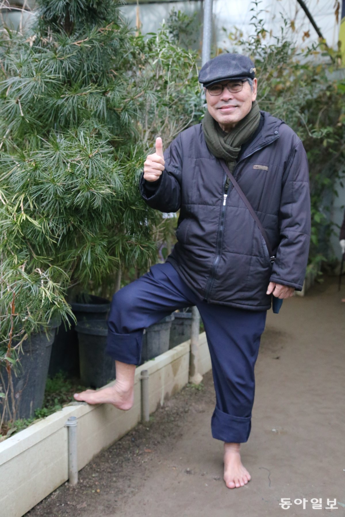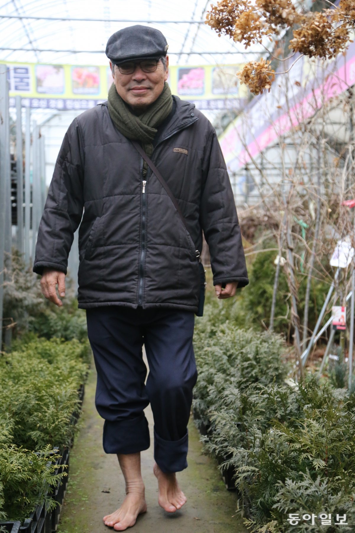 송미카엘 씨가 경기도 과천 우림원예가든센터에서 즐거운 표정으로 걷고 있다. 지난해 2월 요관암 수술을 한 그는 그해 3월부터 맨발로 맨땅을 걸어 많이 회복했다고 했다. 이번 겨울엔 비닐하우스 안에서 걸으며 건강을 지키고 있다. 과천=양종구 기자 yjongk@donga.com