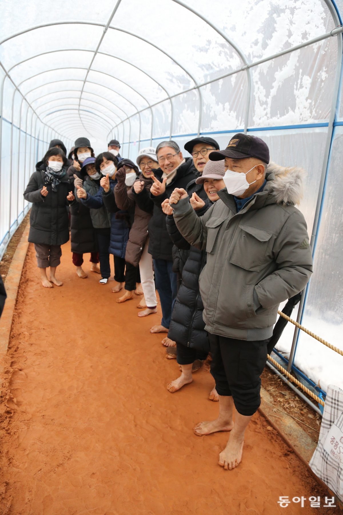 지난해 2월 요관암 수술한 뒤 회복하고 있는 송미카엘 씨(81)는 체감온도 섭씨 영하 20도 아래로 떨어졌던 1월 23일에도 맨발로 6시간을 걸었다. 어떻게 가능했을까? 추위를 전혀 느낄 수 없는 비닐하우스 안에서 걸었다.