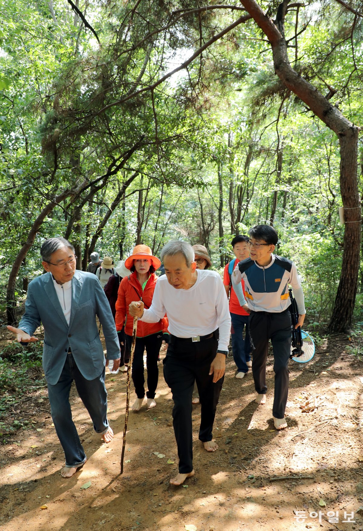 박성태 씨(앞 오른쪽)가 박동창 맨발걷기국민운동본부 회장(앞 왼쪽)과 함께 경기 남양주 와부 금대산을 맨발로 걷고 있다. 2022년 1월 말 전립선암 말기 판정을 받은 박 씨는 그해 2월 말부터 본격적으로 맨발로 금대산을 걸어 2개월 여만에 암의 공포에서 벗어났다. 남양주=이훈구 기자 ufo@donga.com