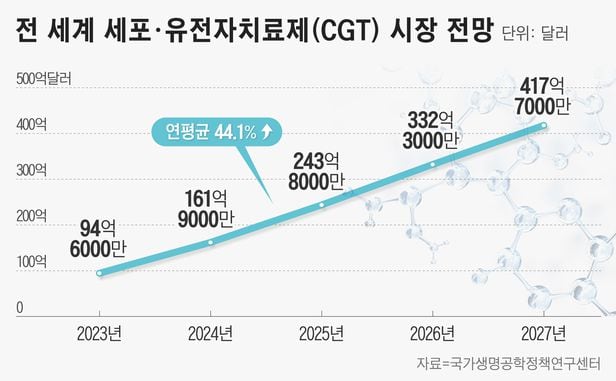 국가생명공학정책연구센터에 따르면 전 세계 세포·유전자치료제 시장 규모는 2023년 94억6000만달러(약 12조원)에서 2027년엔 417억7000만달러(약 55조원)까지 커질 것으로 전망됐다. 연평균 예상 성장률(CAGR)은 44.1%다.