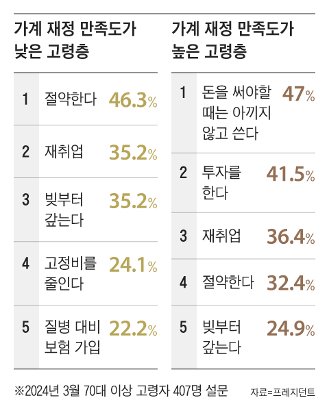 한편, 경제적 만족도가 낮다고 답한 ‘은퇴 불만족군’의 노후 생존법은 ‘자린고비’였다. ‘절약한다’를 선택한 비율이 46%로 가장 높았고 통신비나 OTT구독료 같은 고정 비용을 줄이겠다는 응답자도 4명 중 1명꼴이었다.