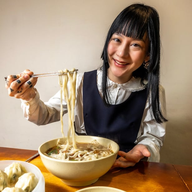 세계적 베스트셀러 ‘H마트에서 울다’를 쓴 미국 록가수 겸 작가 미셸 자우너가 지난 6일 서울 명동교자에서 칼국수와 만두를 맛보고 있다. 어릴 적 어머니를 따라 서울 올 때마다 찾던 식당이다. 손가락의 문신은 태극기의 건곤감리. /이신영 영상미디어 기자