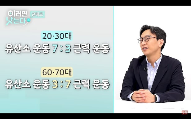 최고의 노화 예방책은 ‘근테크’다. 근테크는 근육과 재테크를 합친 신조어다. 정 교수는 “30대부터 1년에 약 1%씩 근력이 떨어지기 시작하고, 60대에 이르면 그 속도가 더 빨라진다”며 “노화를 막는 가장 확실한 방법은 근육에 투자하는 것”이라고 했다. 정 교수는 노인일수록 걷거나 달리기 같은 유산소 운동보다 계단 오르기와 스쿼트, 플랭크, 런지 같은 근력 운동에 더 신경 써야 한다고 조언했다. 그는 “걷는 것만 가지고는 100세까지 갈 수 없다”며 20~30대는 유산소 운동과 근력 운동을 7:3 비율로, 60~70대는 3:7 비율로 할 것”을 권장했다.