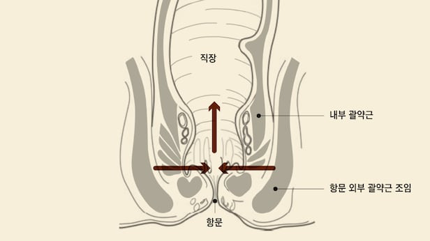 항문 기능은 내부와 외부, 두 개의 괄약근에 의해 조절된다. 내부 괄약근은 평소에 닫아 두었다가 배변 시 자동으로 열리는 근육이다. 외부 괄약근은 조임 기능으로 대변 배출을 의식적으로 제어할 수 있는 근육이다.