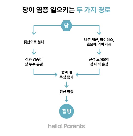 이뿐만이 아닙니다. 암세포는 당을 먹고 자라고, 해로운 장내 미생물 역시 당에 의존해 살아가요. 대량의 당은 간에서 알코올처럼 독소 물질로 대사됩니다. 술을 안 마시고도 지방간 질환에 걸릴 수 있는 이유죠. 저자는 요즘 아이들에게 성조숙증이나 ADHD(주의력결핍과다행동장애)가 증가한 원인도 설탕이 촉진한 호르몬 불균형과 뇌 염증 때문이라고 주장합니다.