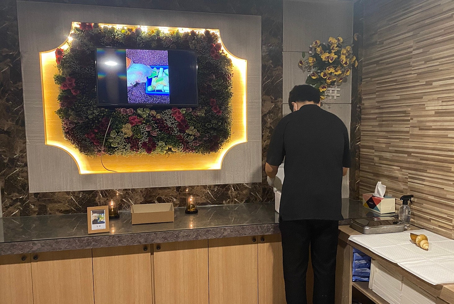 반려 달팽이(아프리카왕달팽이) 장례식장 풍경. 생전의 건강한 모습을 화면에 띄우고 영정 사진도 준비했다. 장례지도사 우측에 사체가 놓여 있다. /독자 제공