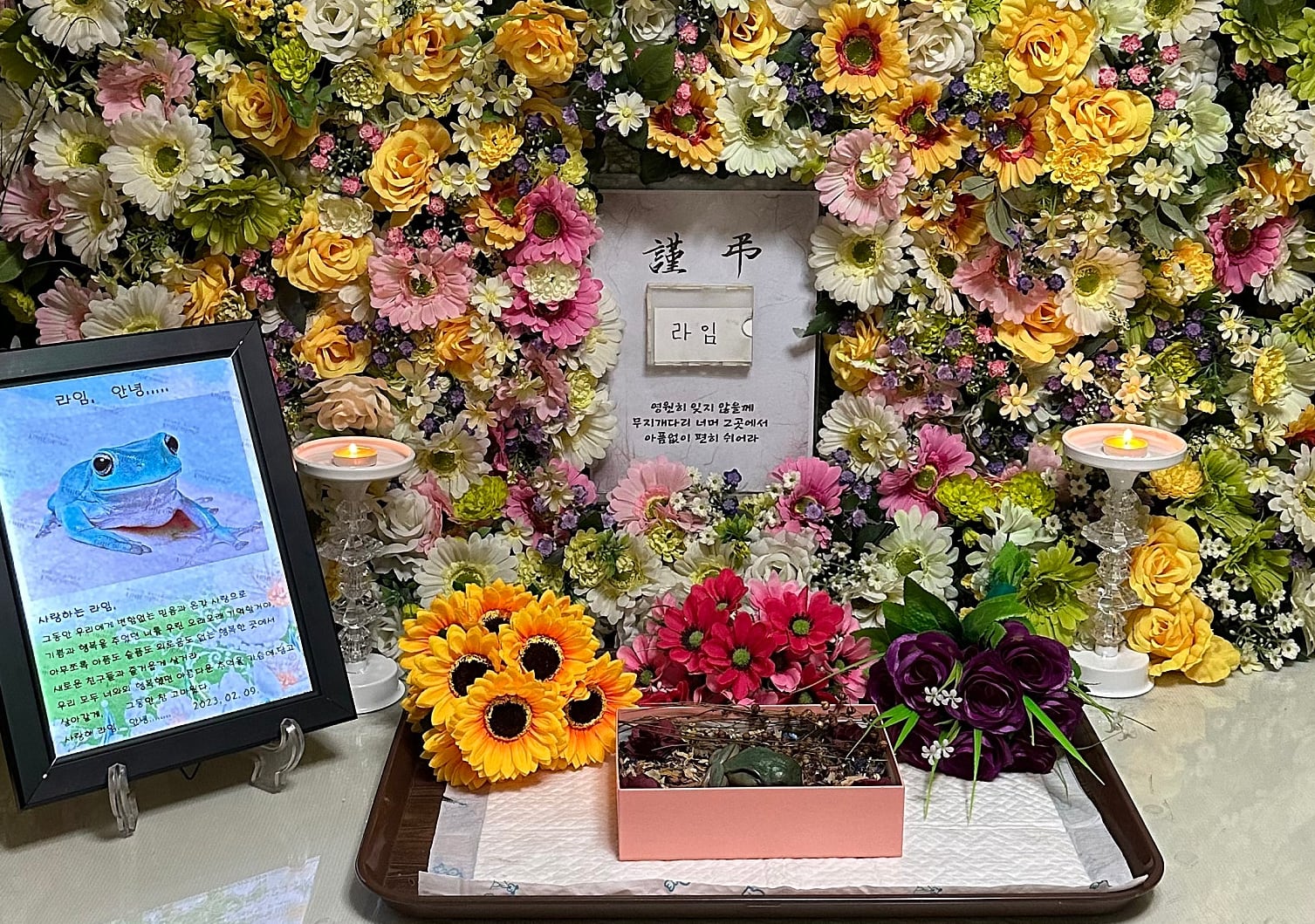 반려 개구리를 위해 꾸려진 제단. 초록색 개구리는 작은 상자 안에 잠들어있다. /독자 제공