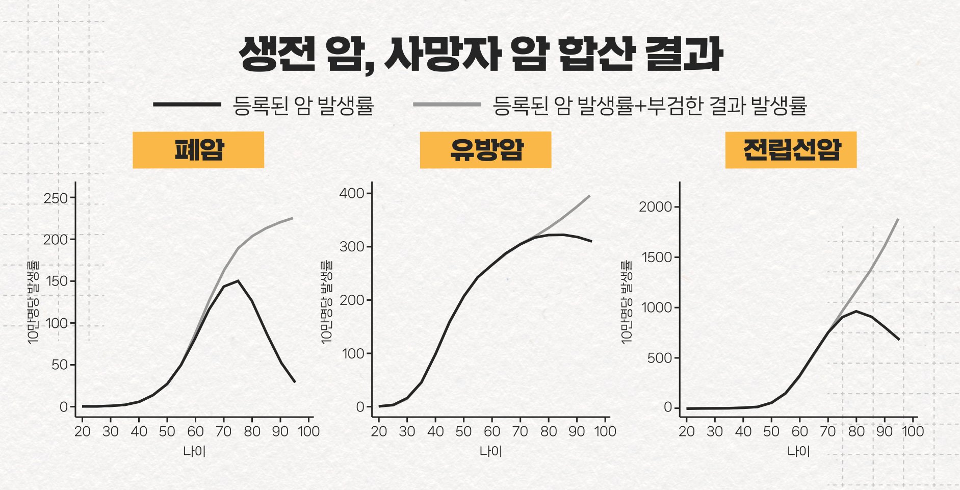 스웨덴 암 등록 데이터엔 초고령자가 되면 발생률이 줄었지만, 부검 결과 발견된 암까지 다 더하자 암 발생률은 나이에 따라 꾸준히 증가했어요.