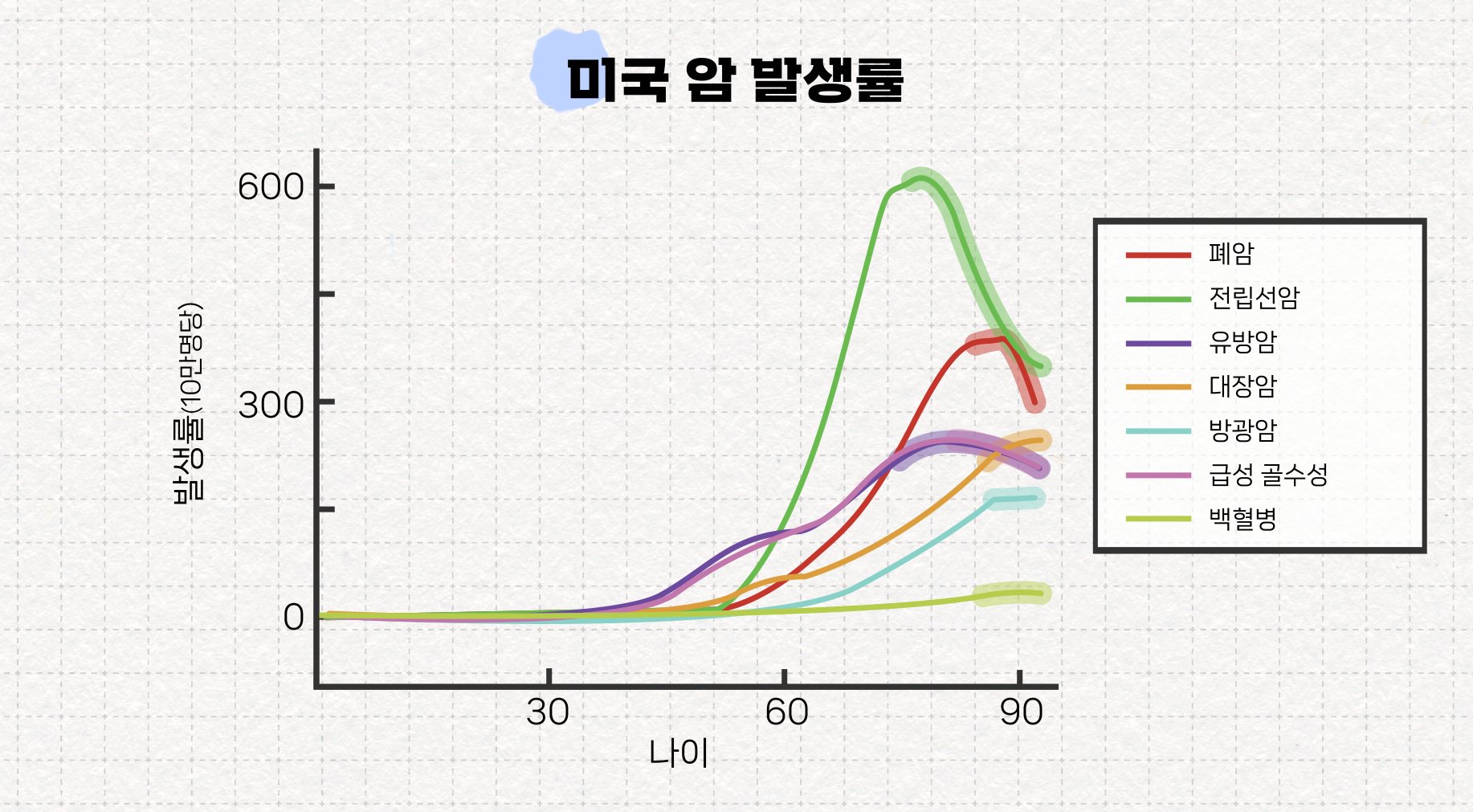나이가 60, 70, 80을 넘어가면 암 발생이 오히려 줄어들기 시작합니다.