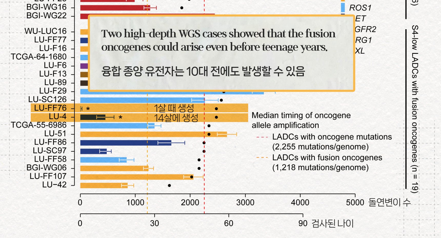종양을 유발하는 융합 종양 유전자 돌연변이는 심지어 한 살 때 발생하는 것도 있었다. 우리는 아주 어릴 때부터 암의 씨앗을 품고 산다는 것이다. 하지만 이게 발현되려면 오랜 시간 더 많은 다른 돌연변이의 축적이 필요하다.