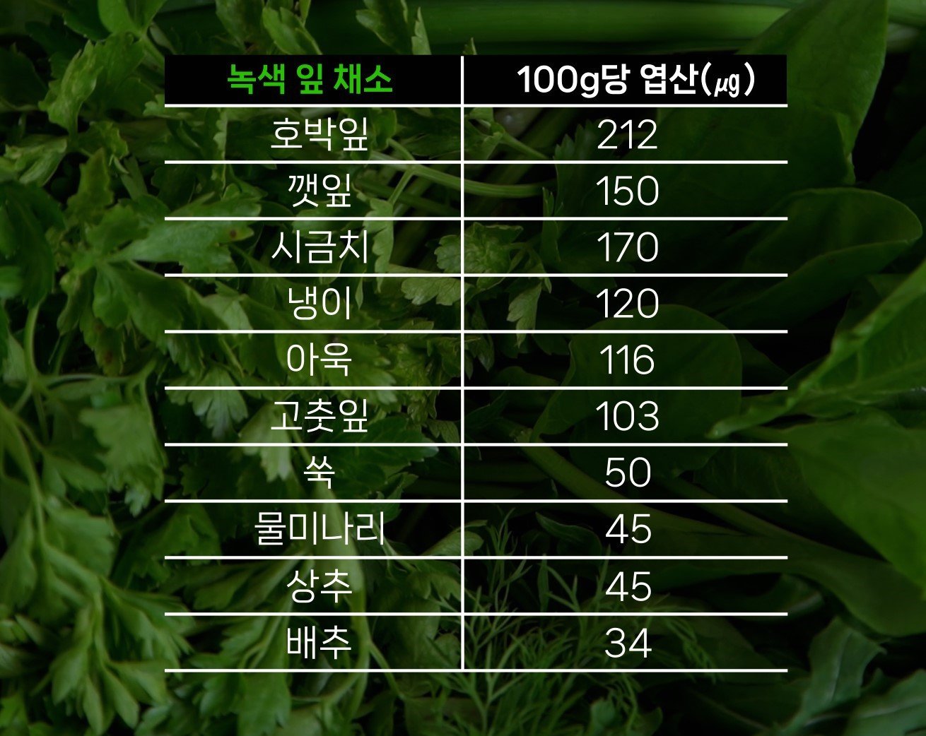 이미지크게보기 짙은 초록잎채소엔 특히 엽산이 많이 들어 있다. 하지만 술을 너무 많이 마시면 엽산이 흡수되지 않기 때문에, 아무리 엽산을 많이 먹어도 효용이 전혀 없을 수 있다.