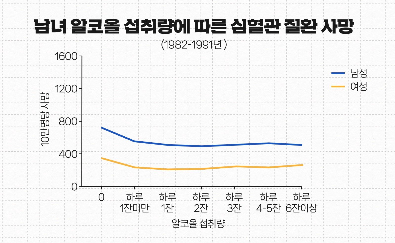 이걸 J자, 혹은 U자 곡선이라고 하는데요. 음주 관련 연구에서 정말 많이 등장합니다. 이걸 보면 마치 술을 안 마시는 게 손해인 것처럼 보여요.